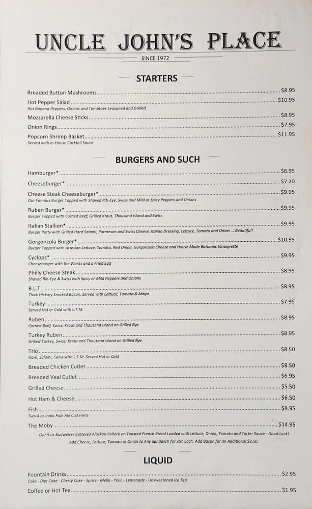The menu at Uncle John's offers simplicity and traditional American flavors. Burgers shine here, with options like the classic cheeseburger and the Reuben burger. Prices remain accessible, typically under $20.